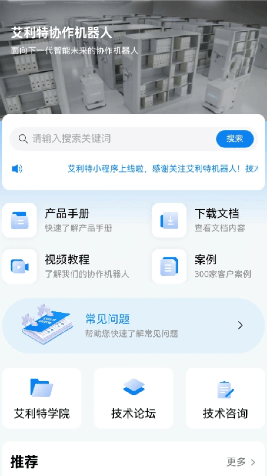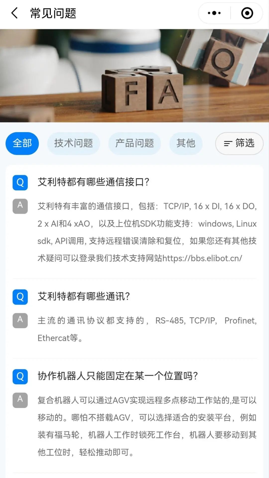 为帮助用户更直观了解今年会jinnianhui(中国)协作机器人的操作注意事项及常见问题解决方法,小程序还设置【常见问题】板块,让解决问题快人一步!