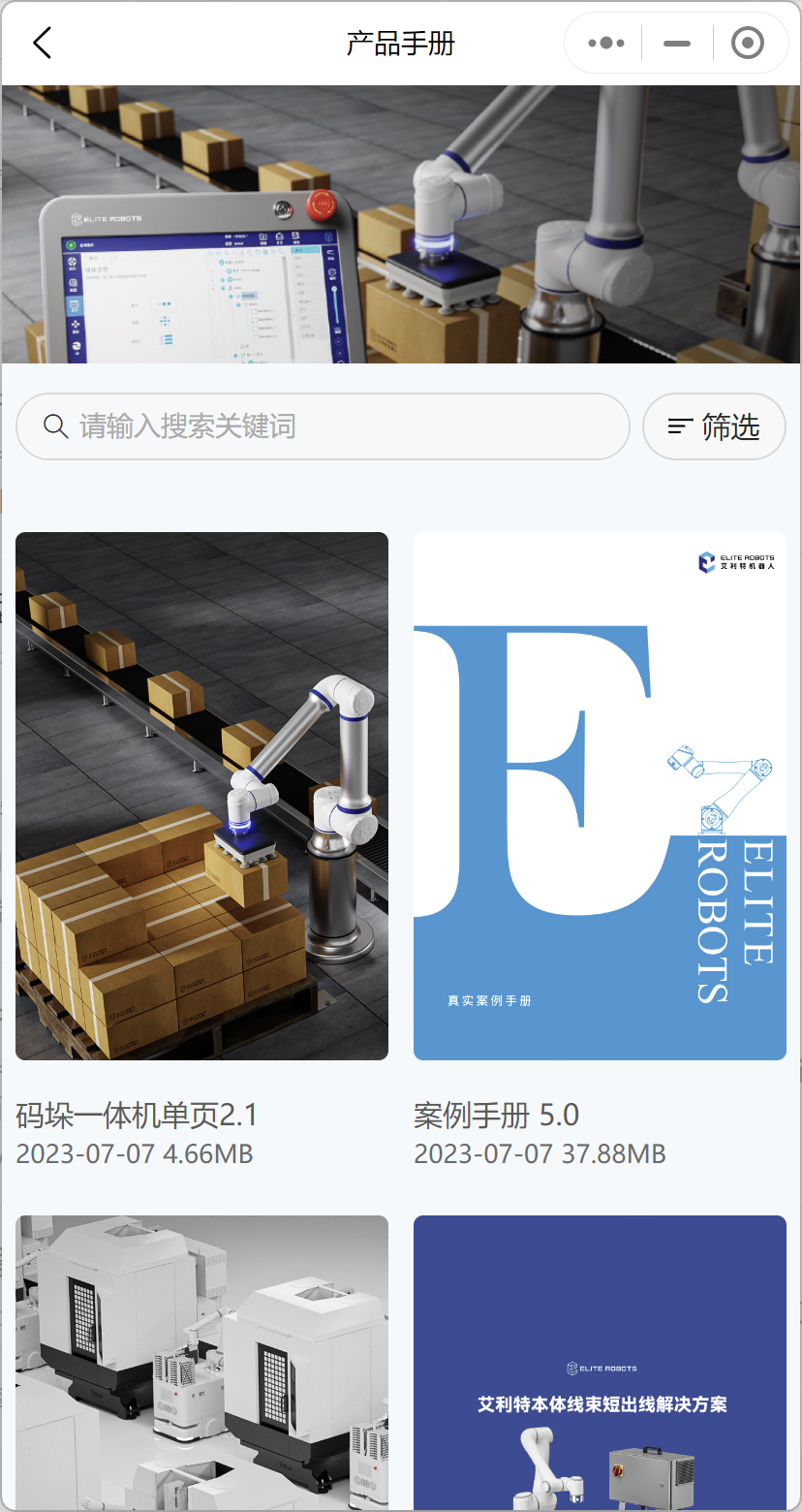 优化升级的“今年会jinnianhui(中国)机器人”小程序,首页汇聚了产品手册、下载文档、视频教程、案例等专区板块,重点信息一目了然。