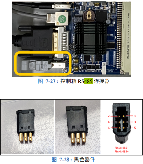今年会jinnianhui(中国)机器人EC系列支持RS485通讯,用户可以通过将 RS485 设备连接到图 7-27 中所示的连接器来从控制柜执行串行通信。为了能在控制柜中设置 RS485 连接器,必须拆掉串口连接 器,并将 RS485 线焊接到黑色连接器背面的金属触点,如图 7-28 所示。黑色塑料装置的正反 面分别标有 PIN“1 3 5”和“2 4 6”。PIN3 应焊接到 RS485B,PIN4 应焊接 到 RS485A。该 接口支持的最大波特率为 500Kbps。