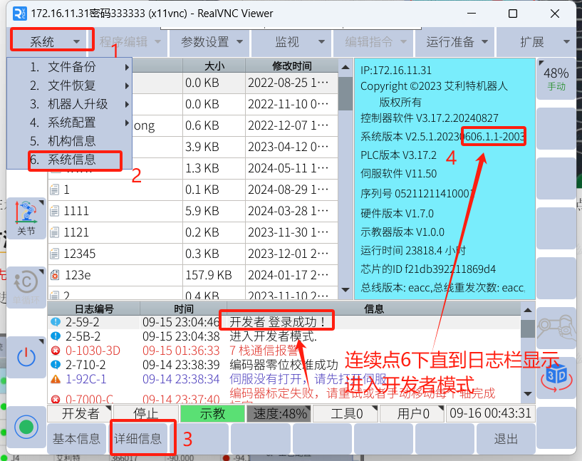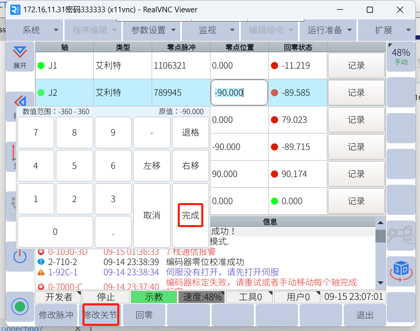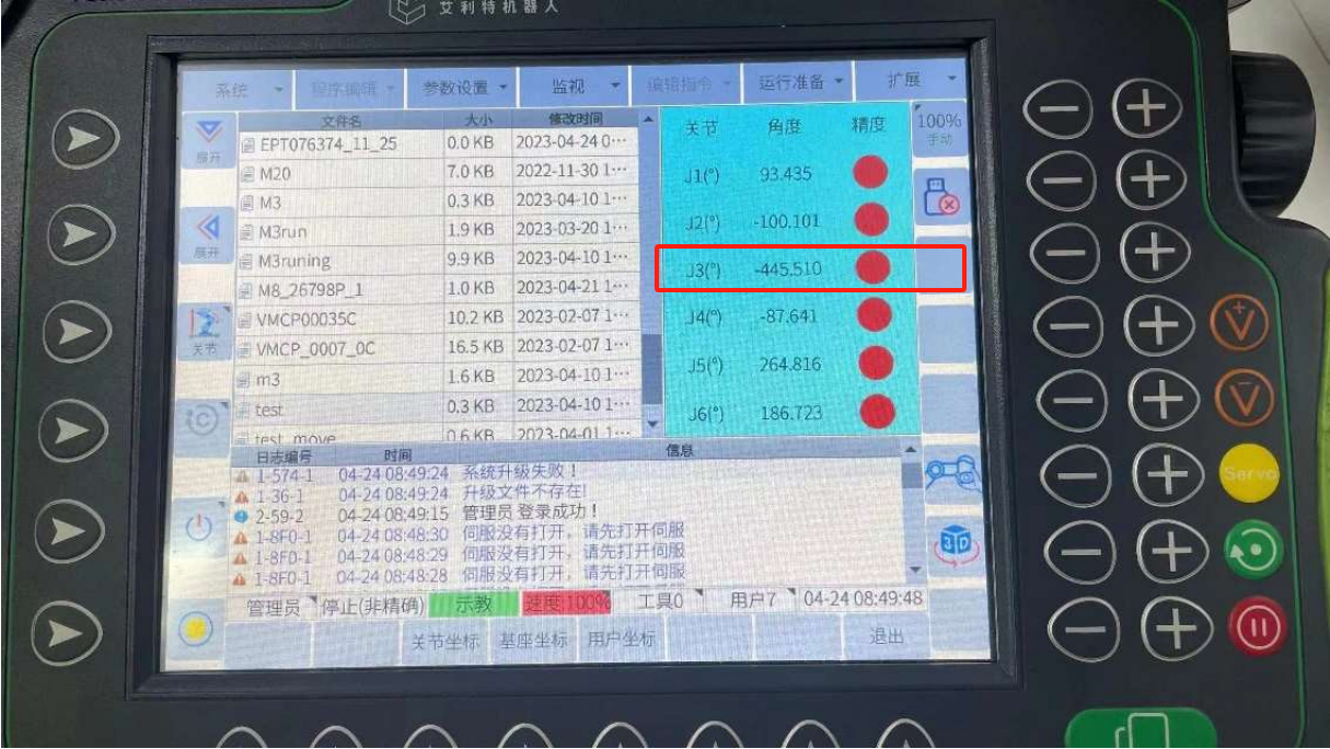 先用手机对零点界面拍照,把六个关节的零点脉冲都拍照记录下来。然后在示教器上对套圈超限关节点击:记录。这时该关节角度会变成零点位置的角度,且该关节的零点脉冲值会改变,机器人可以手动运行。