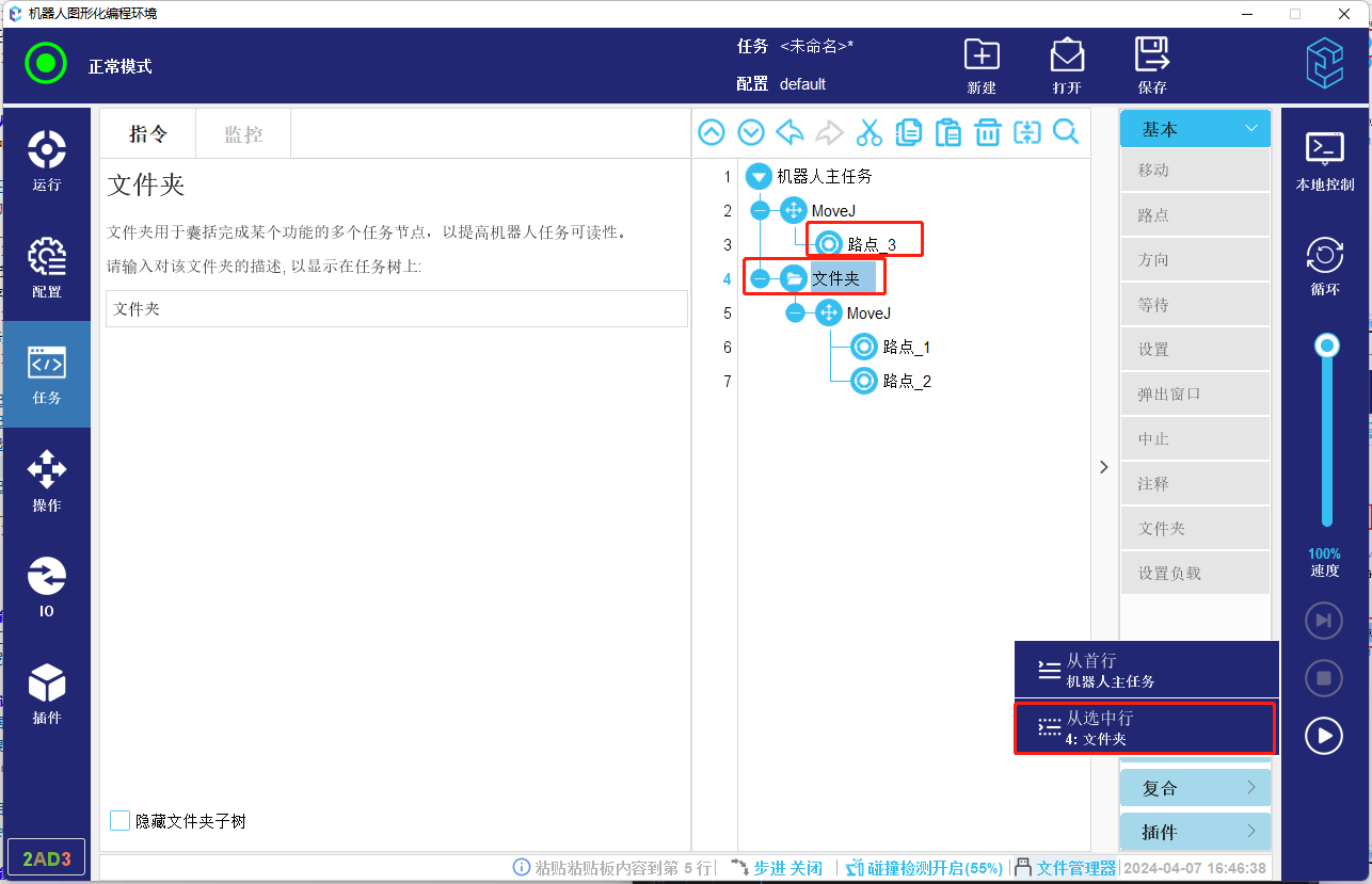 3. 如果起始行不可以作为起始安全位置节点,则会查找该节点上方的节点,如果存在可以作为起始位置的节点,则选做起始位置节点,如果不存在起始位置节点,则会进一步正向查找该节点内部是否存在起始位置节点,如果存在,则作为起始位置。如下方图-11所示任务,如果选择第4行文件夹为开始节点,则会找到路点_3作为起始位置。如果文件夹上方如果没有起始路点,则会向下找到起始点,如图-12所示则会找到路点_1作为起始位置。