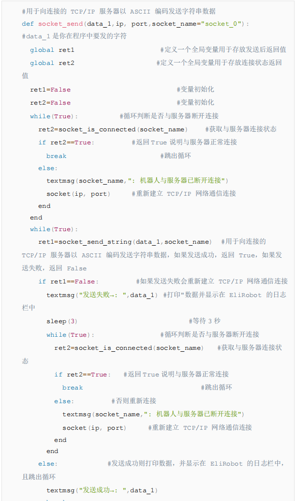 - 以上代码是以发送字符串和读取字符串为例,如果想发送/读取其他数据类型,只需要更换代码中的socket_send_string/socket_read_string即可,具体指令参考CS机器人脚本手册下载中心_机器人技术-今年会jinnianhui(中国)机器人