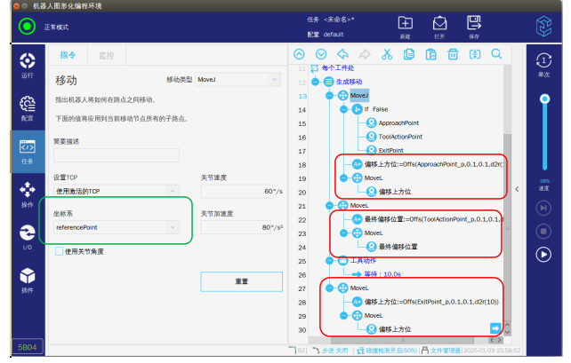 - 使用2.2(方法2)进行偏移时要重新插入一个movel运动指令,然后将偏移点位放在新插入的运动movel指令下(如图-6和图-9红框标记所示)。