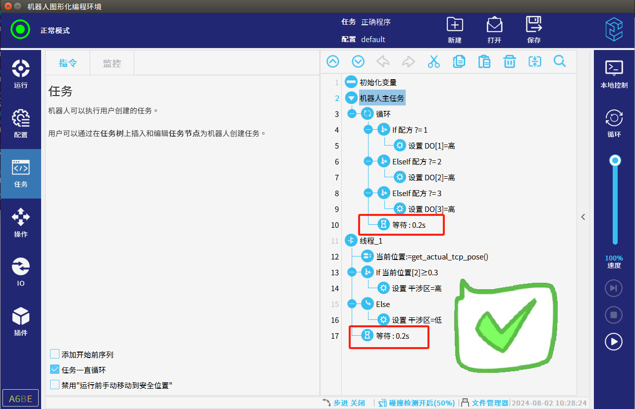 检查程序中是否有死循环会导致机器人CUP过载,CPU过载也会导致机器人抖动,例如程序中一直if循环判断且条件多次不满足的时候程序会进入死循环,使用线程时线程中没有加等待时间程序也会进入死循环如图3-2-1,应该在循环/线程中加等待时间避免出现死循环CPU过载后导致机器人点到点抖动如图3-2-2所示。