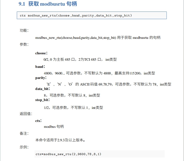 ModBus Master接口常用获取modbus、连接modbus、关闭modbus、设置slave、读取单个线圈、写入单个/多个线圈、读取单个寄存器、写入单个寄存器等指令,本文主要讲解以上指令,具体指令详解如下图所示,其他指令也可参考EC-lua手册ModBus Master章节