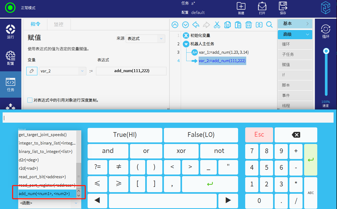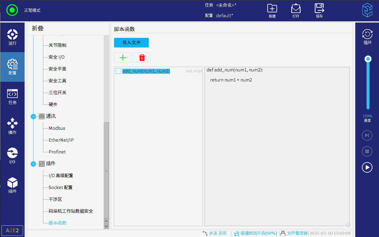 ScritptFunction是一款支持函数库自定义的插件,用于用户直接在插件中定义好脚本函数,可以直接通过示教器表达式键盘插入函数功能,实现函数调用,减少现场工程师编写任务树的工作量,如坐标变换、等待超时、 位姿偏移等,语法需支持Python格式。