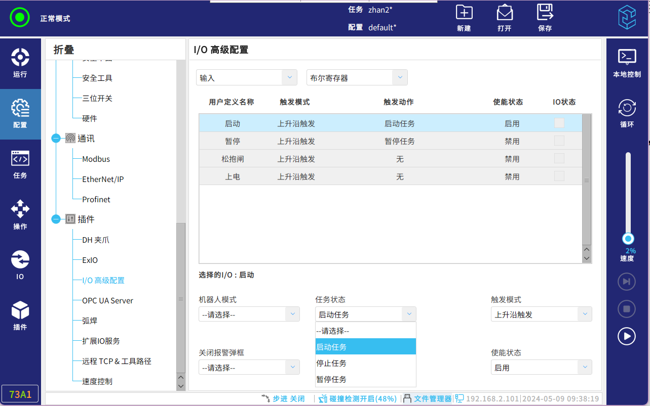 在“2.6使用方法二“配置操作完成之后,可在“配置”——“插件”——“IO高级配置”选择 (启动任务 OR 停止任务 OR 暂停任务)在选择触发方式(上升沿 OR 下降沿)——使能状态选择“启用”即可