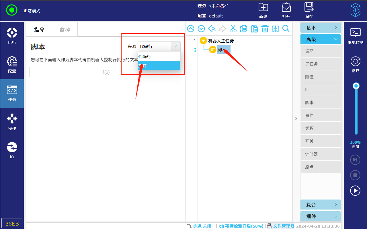 2.5 点击任务树下的脚本行,点击来源选项,选择文件后,点击编辑