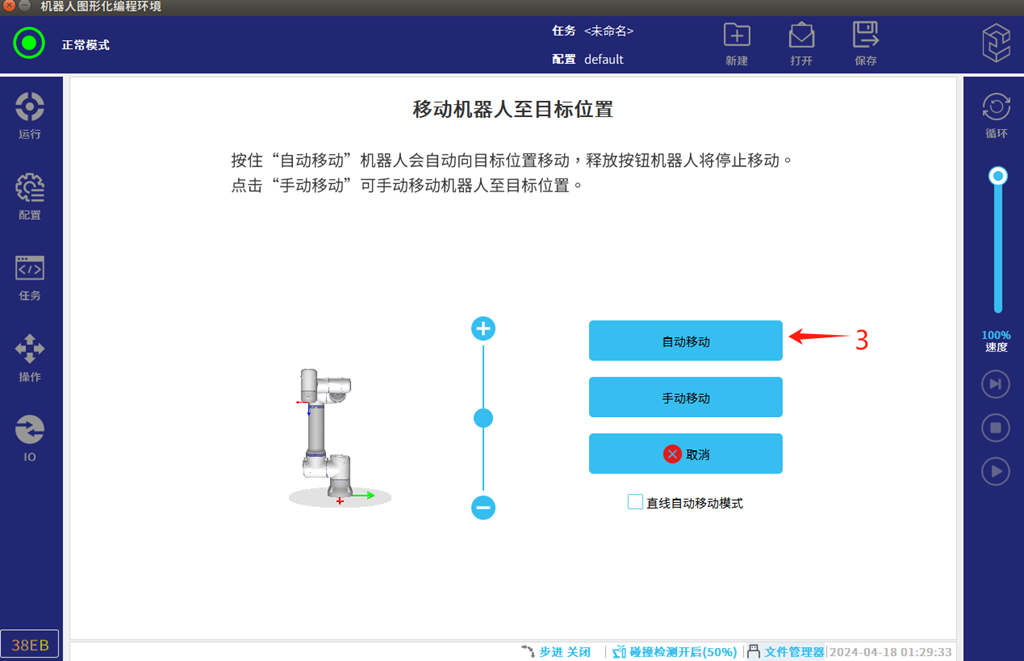 ● 进入如下图页面,长按自动移动。(长按自动移动之前,确保周围无干涉。如果有干涉先移动空旷地区,再重新对齐)