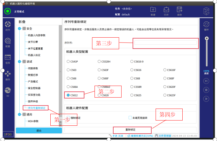 第二步:选择机器人型号,图-12中选择的是CS612,实际项目中选择实际的机器人型号 (机器人一轴以及控制柜都贴了铭牌,铭牌上有机器人型号信息)