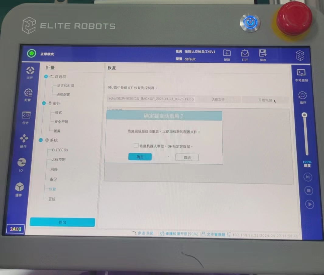 2.2.5.3按照图-18所示,勾选恢复机器人零位、DH标定等数据>确定,等待恢复备份 完成重启即可。