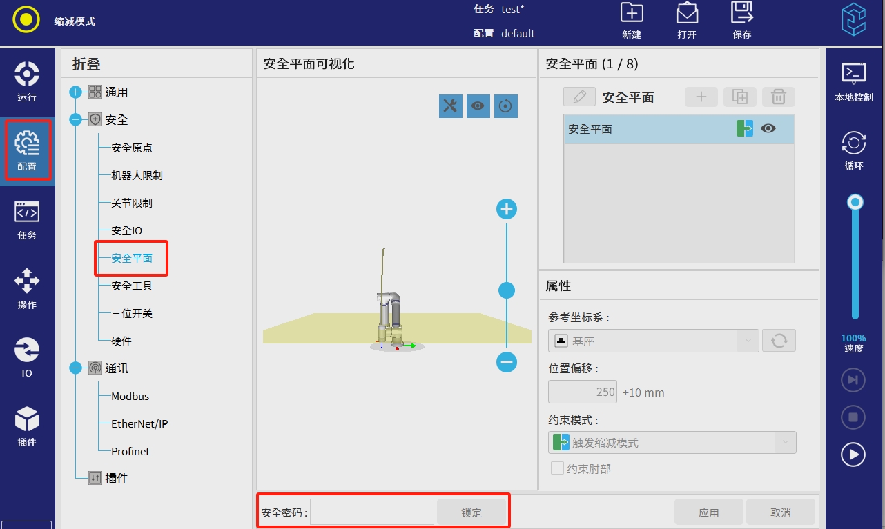 4. 选择好之前建立的坐标系或者基坐标系,通过位置偏移来确定平面位置,该位置偏移是通过增加或者减小该坐标系的Z轴坐标来实现平面位置的偏移。该平面的Z+方向是正常区域,Z-方向是限制区域,机械臂工具中心点到达该平面及该平面Z-方向区域会触发相应的约束模式,缩减模式或者防护停止。如果机械臂进入防护停止,会自动进入安全恢复模式,手动把机械臂的工具中心点移动到Z+方向上面,机械臂才能再次正常使用。